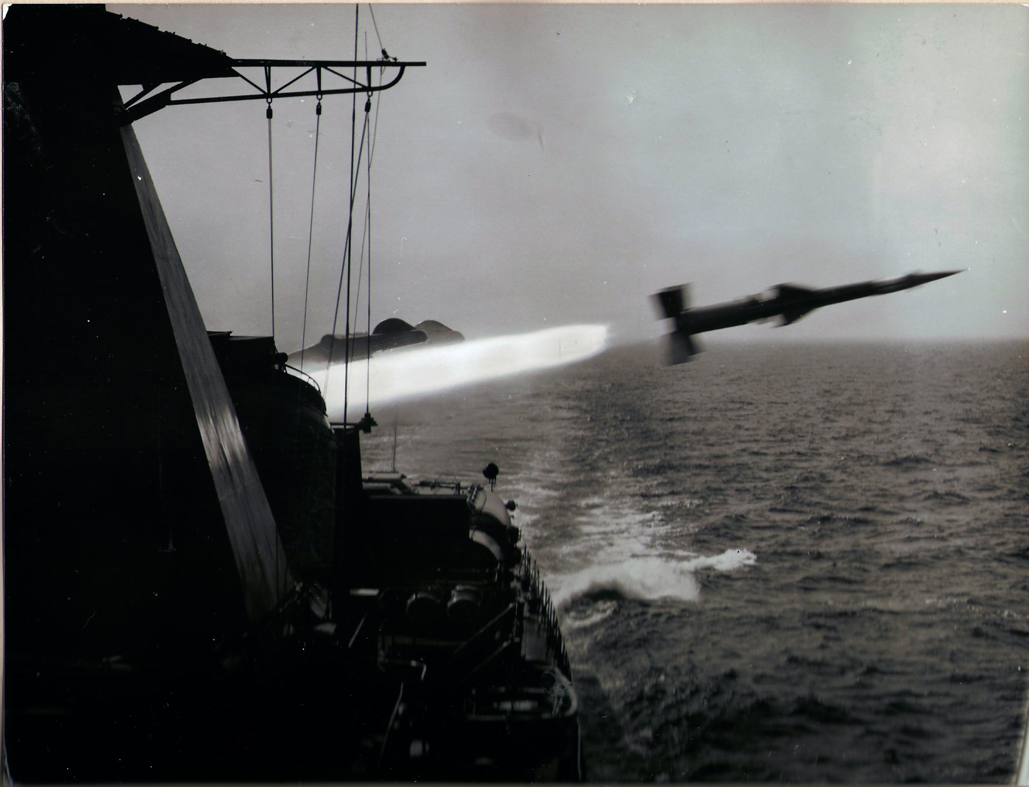 Niszczyciel ORP " Warszawa "/275/ podczas strzelania rakiet , lata 70-te .