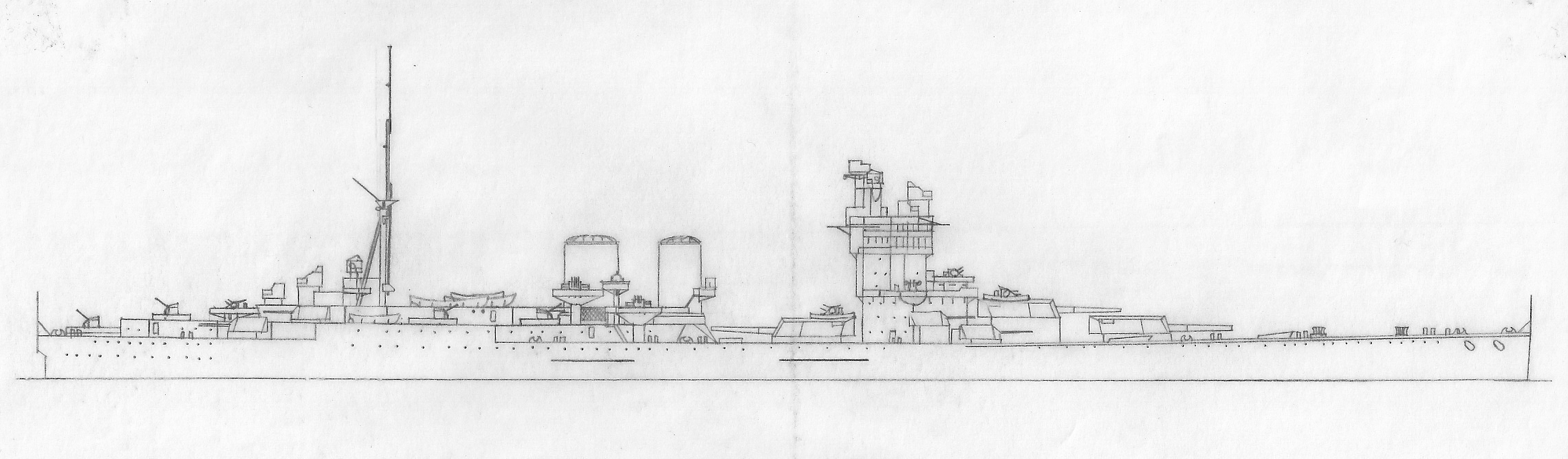 Ponieważ dawno już nikt nie dorzucał nowości w tym wątku, to postanowiłem podrzucić moje fantazje związane z krążownikiem liniowym typu G-3. Pierwszy rysunek to G-3 "po modernizacji" wojennej. Natomiast drugi, to krążownik uderzeniowy "po modernizacji" z przełomu lat 80 i 90 -tych. Z góry przepraszam za jakość rysunków, ale są to skany rysunków robionych ołówkiem na kalce.