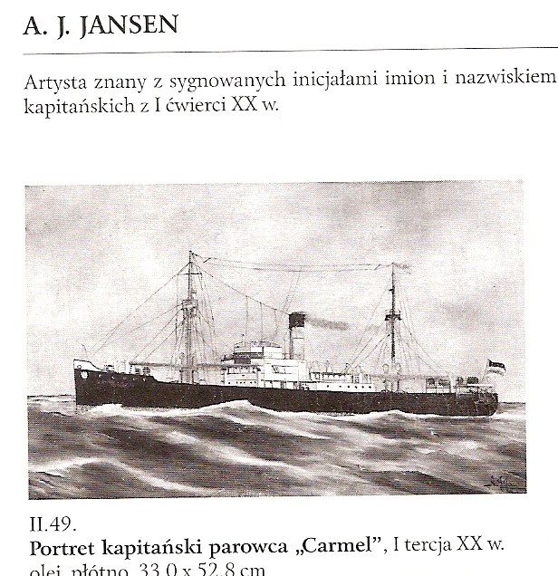 Narodowe Muzeum Morskie jest w posiadaniu obrazu kapitańskiego frachtowca Carmel, nazwa zapewne od słynnego klasztoru. Niestety nie wisi w Galerii Miorskiej, a w magazynie. Moim zdaniem wygląda na budowę 1922-1932, ma starannie zaprojektowane maszty i w ogóle takielunek, może by parowcem jak podpisano, choć motorowca wykluczyć na 100% nie można. Bandera wygląda na niemiecką z okresu przed III Rzeszy.