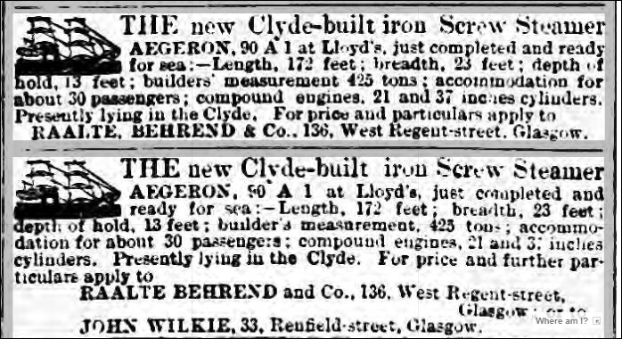 11.02.1874 registered #15 at Glasgow ON68075 AEGERON