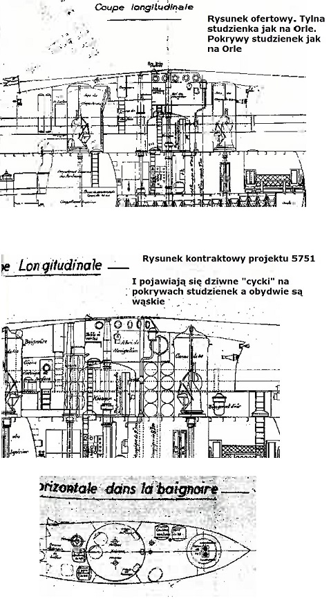 Sądzę jednak, że rysunek kontraktowy, to też jeszcze nie ostatnia wersja jaka by była. Oferta powstała prawdopodobnie w odpowiedzi na nadesłanie przez stronę Polską wstępnych rysunków Orła na zasadzie "zróbcie nam coś takiego". Dlatego pierwsze francuskie rysunki miały działo 105 mm z przodu jak na Orle. Zakładam, że tak samo było ze studzienkami na Boforsy. Wyciągnęli z szuflady rysunek z 1935 r. i też "zróbcie nam coś takiego".