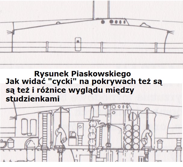 Rzeczywiście rysunki Piaskowskiego (EDYCJA na słuszną uwagę moderatora - przepraszam) przedstawiają nieco inną studzienkę i pokrywę jego luku. Też można domniemywać dlaczego? Ale co do „normalnych” to już zaprotestuję, bo widać lufy wpuszczone w wyoblenia w pokrywach, jakich na Orle nie było. Jedno wyoblenie Piasecki narysował jeszcze dobitniej na rysunku z przodu kiosku tworząc domniemaną sylwetkę boczną nowych okrętów.dolek2 pisze:Nie wiem na ile jest wiarygodny przekrój "Orłów mod." opublikowany w książce Piaskowskiego ale jeżeli jest z nim wszystko OK to widać tam bardzo dobrze studzienki działek i mają one "normalne" pokrywy.