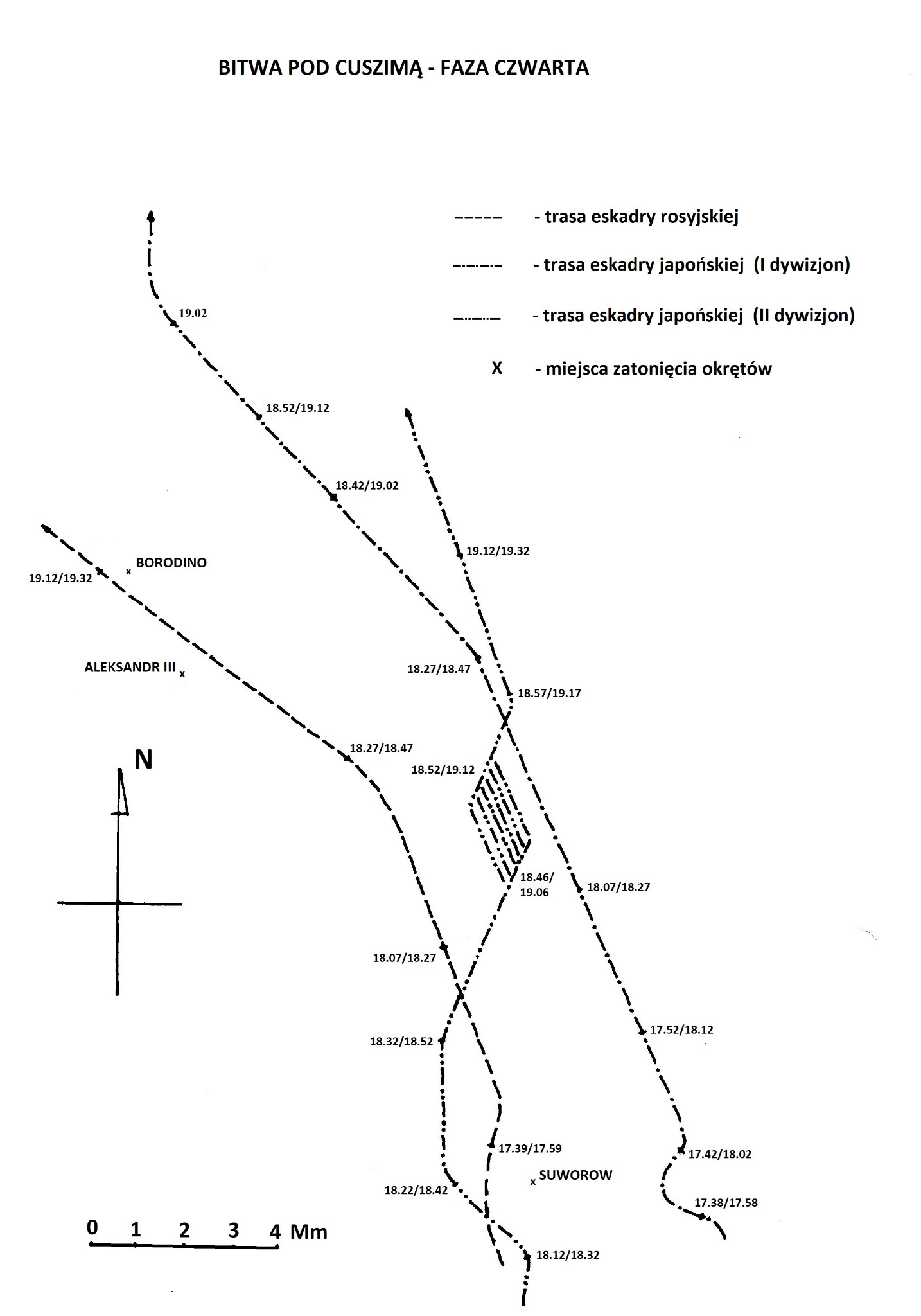 Napoleon pisze: 2021-06-28, 09:36 To niemożliwe. Zamieszczam poniżej mapkę czwartej fazy (będzie w książce) - nijak nie mógł być zaangażowany w walce z lewej burty. Owszem, przez krótki czas mógł być ostrzeliwany od tyłu z lewej burty przez krążowniki Kamimury, ale krótko i na pewno nie to zadecydowało o jego zatonięciu - o tym zadecydował pojedynek z dywizjonem Togo.