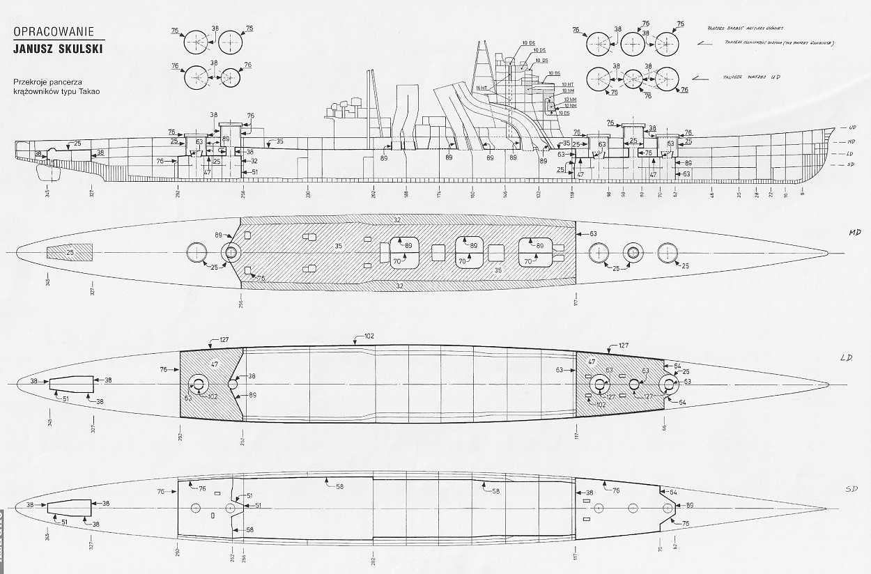 Dzieki za rysunki! Mam pytanie - jak czytac ten rysunek - ile pancernych pokladow mial Hipper - 25+30+30? Czy w krazowniku Kolegi oplaca sie podzielic 70 mm na 20 co detonuje bomby i pociski i 50 co lapie odlamki czy tez taki system bylby za maly i za cienki?