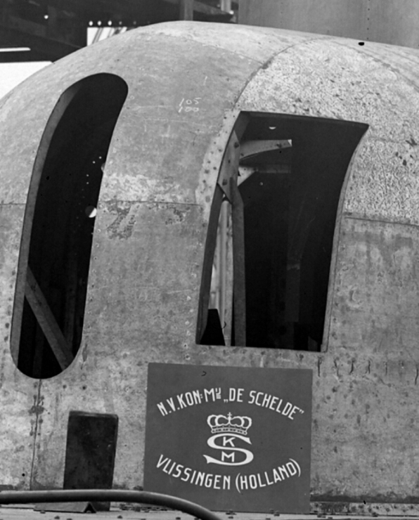 Elementy przednich wzmocnień są wyraźne - mieszczą się w polu ostrości obiektywu. W prawym otworze widać jaśniejszy trójkąt, nieco mniej ostry, wygląda na element wzmocnienia podpory pionowej. Jak dobrze się przyjrzeć widać także w dalszym planie bardzo ciemne elementy dalszej części. O zalewaniu maski świadczy głównie konstrukcja drzwi i otworów drzwiowych, brak uszczelnień. Płaska osłona przy lufie suwała się w prowadnicach, na styk płasko z maską. Lufa na fotografiach także wygląda na niezbyt uszczelnioną w otworze maski. Brak wzmocnień maski umożliwiających skompensowanie nacisku wody. Blachy naciskotrwałe miały o ile pamiętam 2, 5 cm, te widoczne są cienkie. Do tego na jednym z planów konstrukcyjnych elementy kadłuba naciskotrwałego i pozostałe grube blachy zaznaczone są inną, grubszą linią. Maska nie jest.