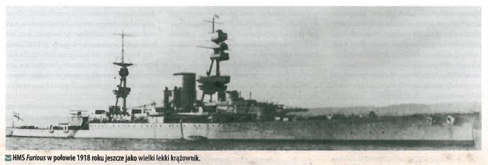 W nr 2/2012 czasopisma Technika Wojskowa Historia znajduje się artykuł "Lotniskowce Courageous i Glorious". Na drugiej stronie tegoż artykułu znajduje się zdjęcie podpisane mniej więcej tak (przytaczam z pamięci): "HMS Furious w 1918 roku jeszcze jako wielki lekki krążownik". Przedstawiony na zdjęciu okręt z całą pewnością należy do trójki wielkich lekkich krążowników. Ma obie wieże artylerii głównej, a dziobowa wygląda, jakby było w niej pojedyncze działo. Czyżby to miał być Furious? Byłaby to prawdziwa sensacja, bo jak dotąd było wiadomo, Furious został ukończony (w 1917 roku!) z tylko rufową wieżą artylerii głównej, w miejscu dziobowej mając hangar.