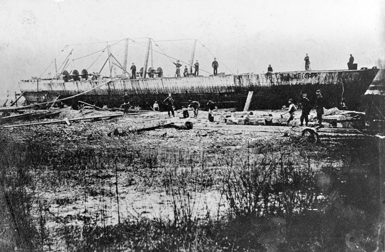 - W lutym 1866 pancernik osiadł na mieliźnie koło Callao. Na rycinie przedstawiono prace ratownicze, przy jego ściąganiu z tejże mielizny.