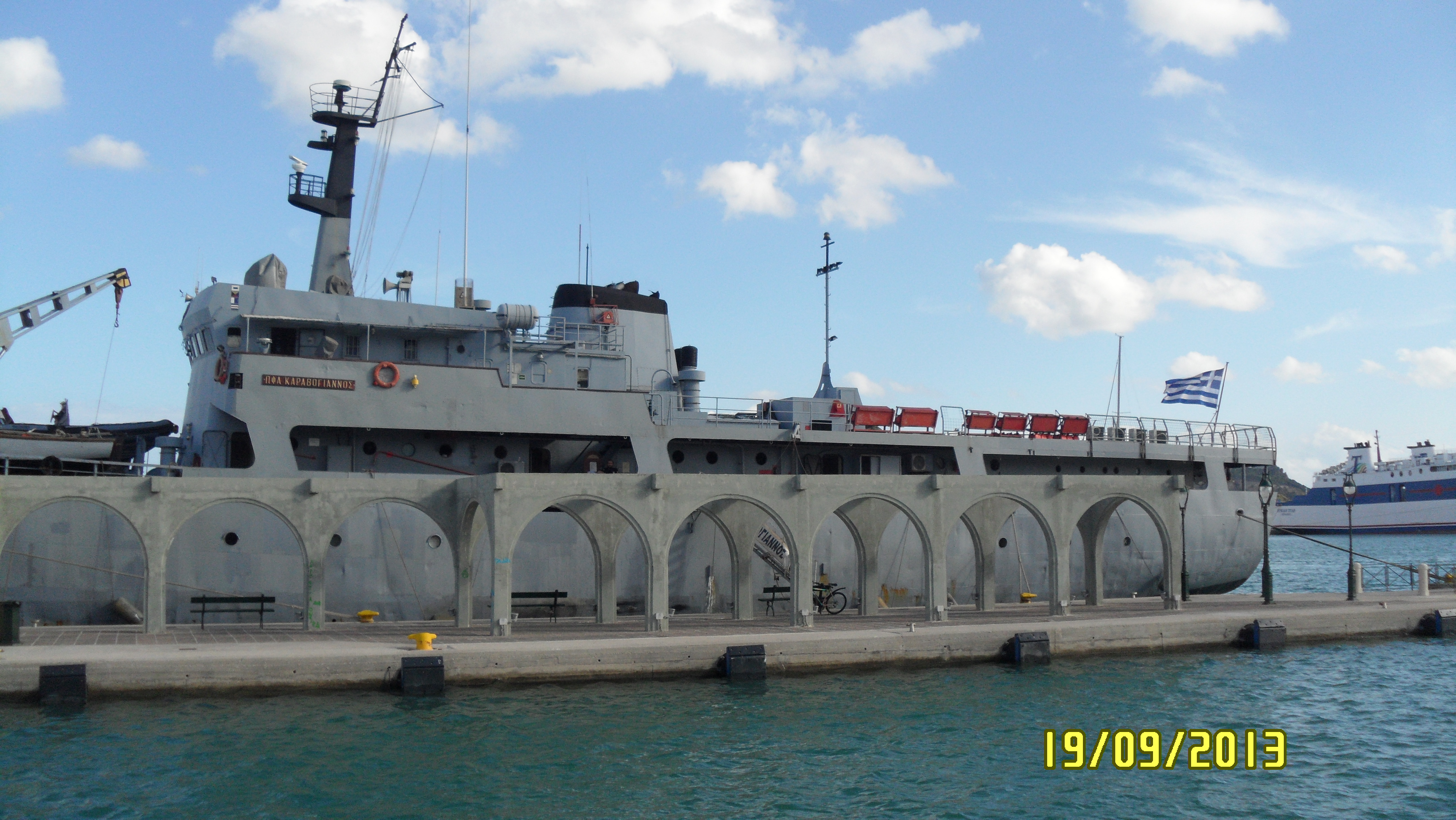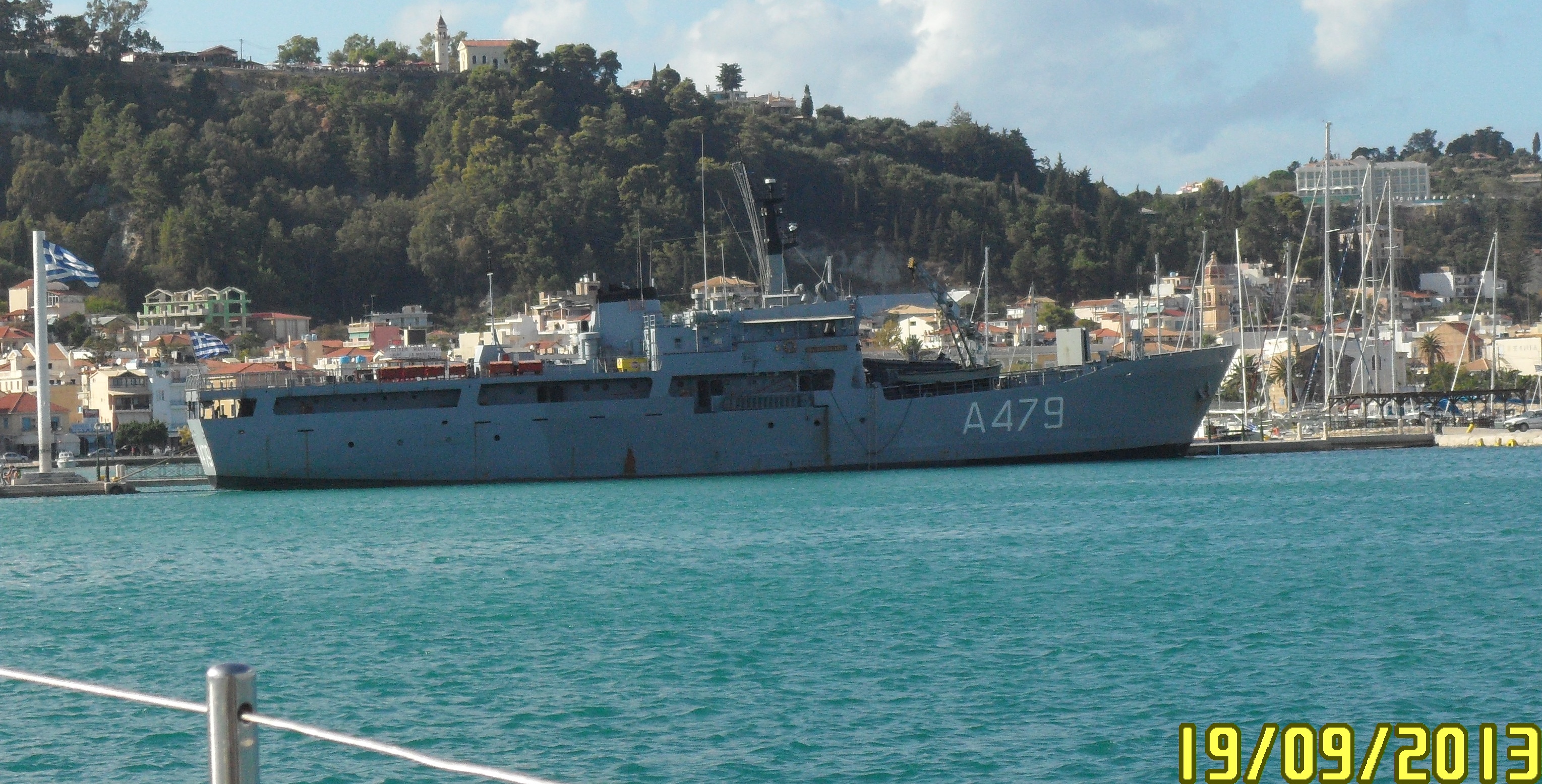 I żeby zmienić temat dyskusji, dorzucę ubiegłoroczne zdjęcie z greckiego portu Preveza. Ten okręt stacjonował tam przez całe lato 2012 i zwykle w nocy wychodził na patrole.