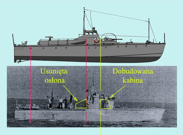 Na zielono umieściłem dość duży wywietrznik widoczny na próbach obu kutrów ( MASB 47 i 48 ) Potem najwyraźniej Anglicy go zdjęli co sugeruje , że był to element zamówiony przez Polaków . W dodatku może świadczyć iż z przodu były pomieszczenia załogi . Natomiast na rys. projektu pomieszczenia te są umieszczone za nadbudówką a z przodu są zbiorniki paliwa. Oczywiście mogę się mylić ale ja tak odczytuje te zdjęcia i rysunki.