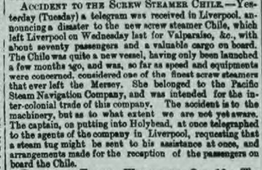 Construido en los astilleros Randolph and Elder, Glasgow, Gran Bretaña. Tenía una máquina compound. Era vapor de propulsión a ruedas perteneciente a la Pacific Steam Navegation Company (P.S.N.C.).