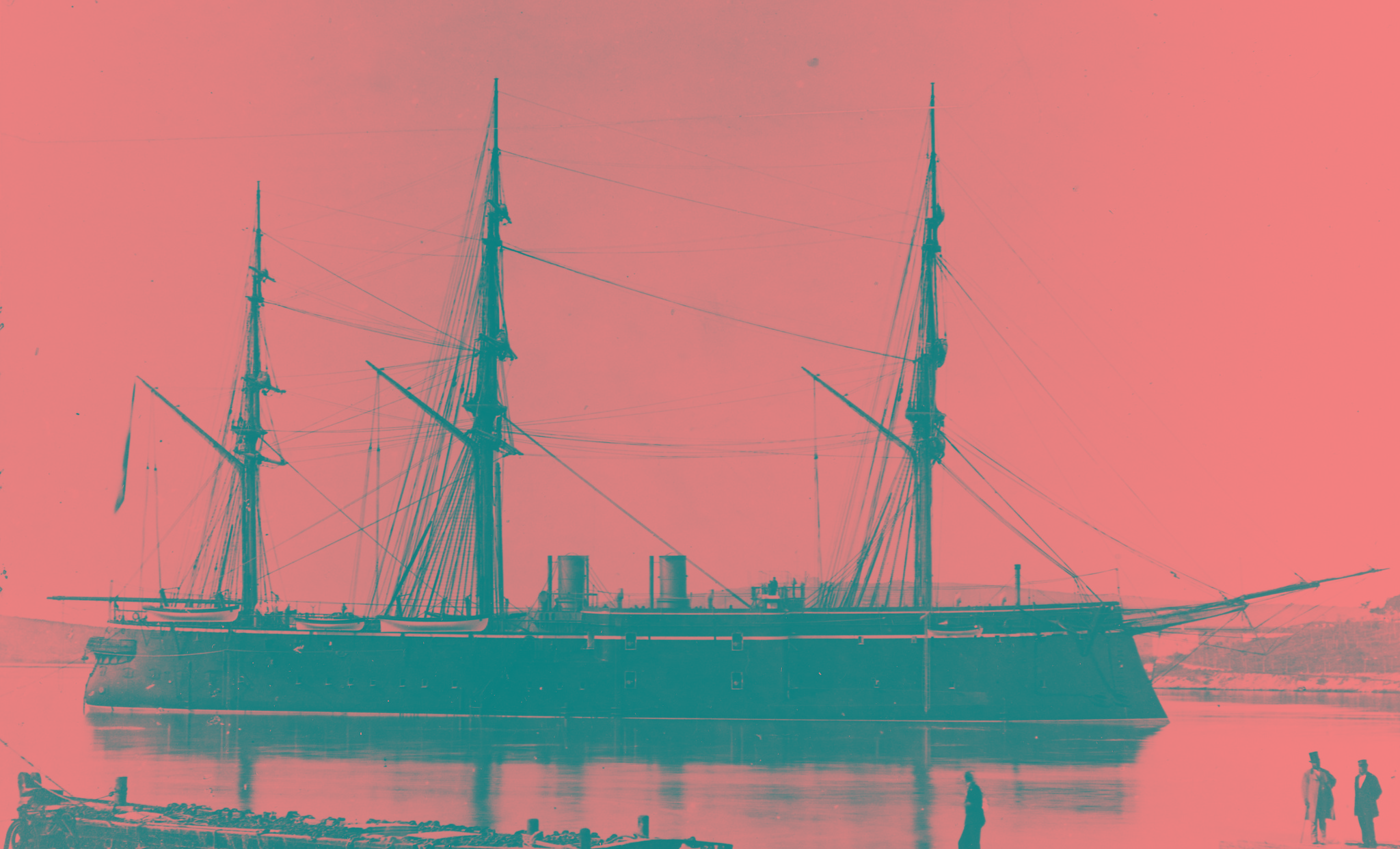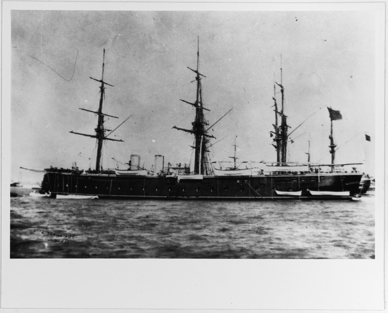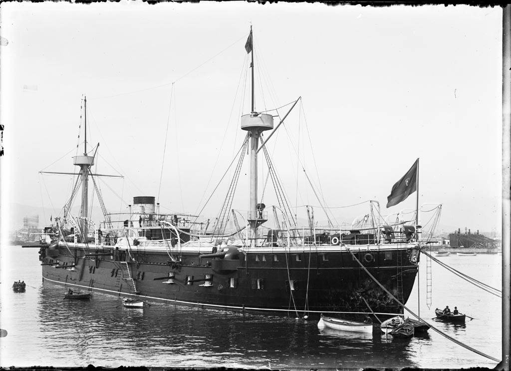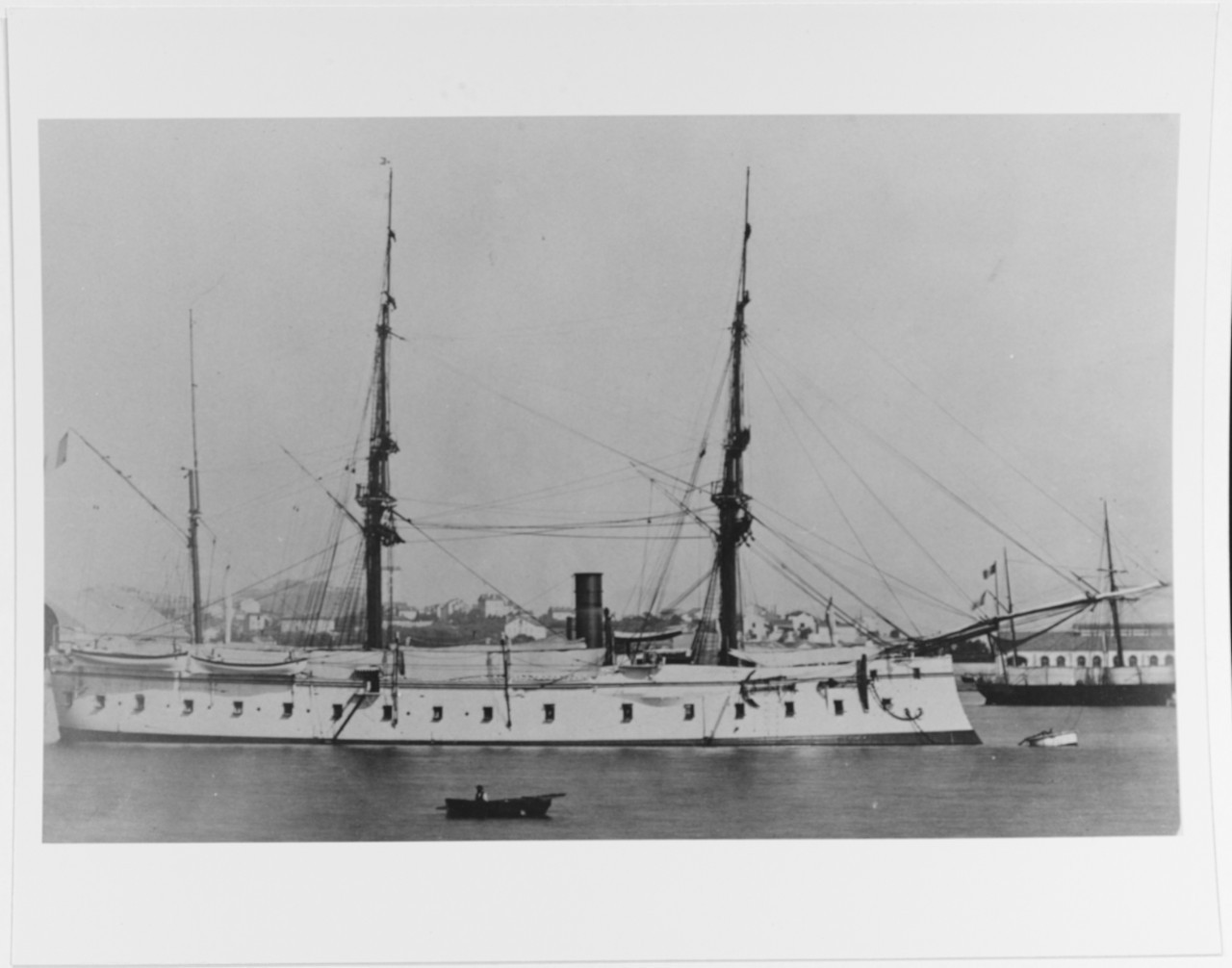 Brytyjski pancernik Pallas (korweta pancerna). Zwodowany w 1865 (do służby wszedł w roku następnym). Miał drewnianą konstrukcję kadłuba. Wyporność 3230 ton, prędkość niecałe 12 węzłów. Uzbrojenie: 8 armat 100 f SB, wymienionych pod koniec lat 60 na 8x178 ML, przy czym dodano im wówczas także 2x160 ML (na dziobie i rufie). Pancerz burtowy i baterii 114 mm.