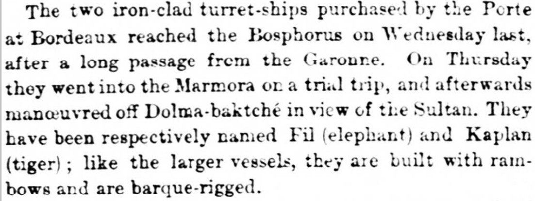 Okrety te nie byly budowane dla Egyptu., tylko dla Chile i nie byly zwodowane w 1868 roku. Zostaly od stoczni kupione przez Turckje, ktora wygrala wyscig z Grecja.