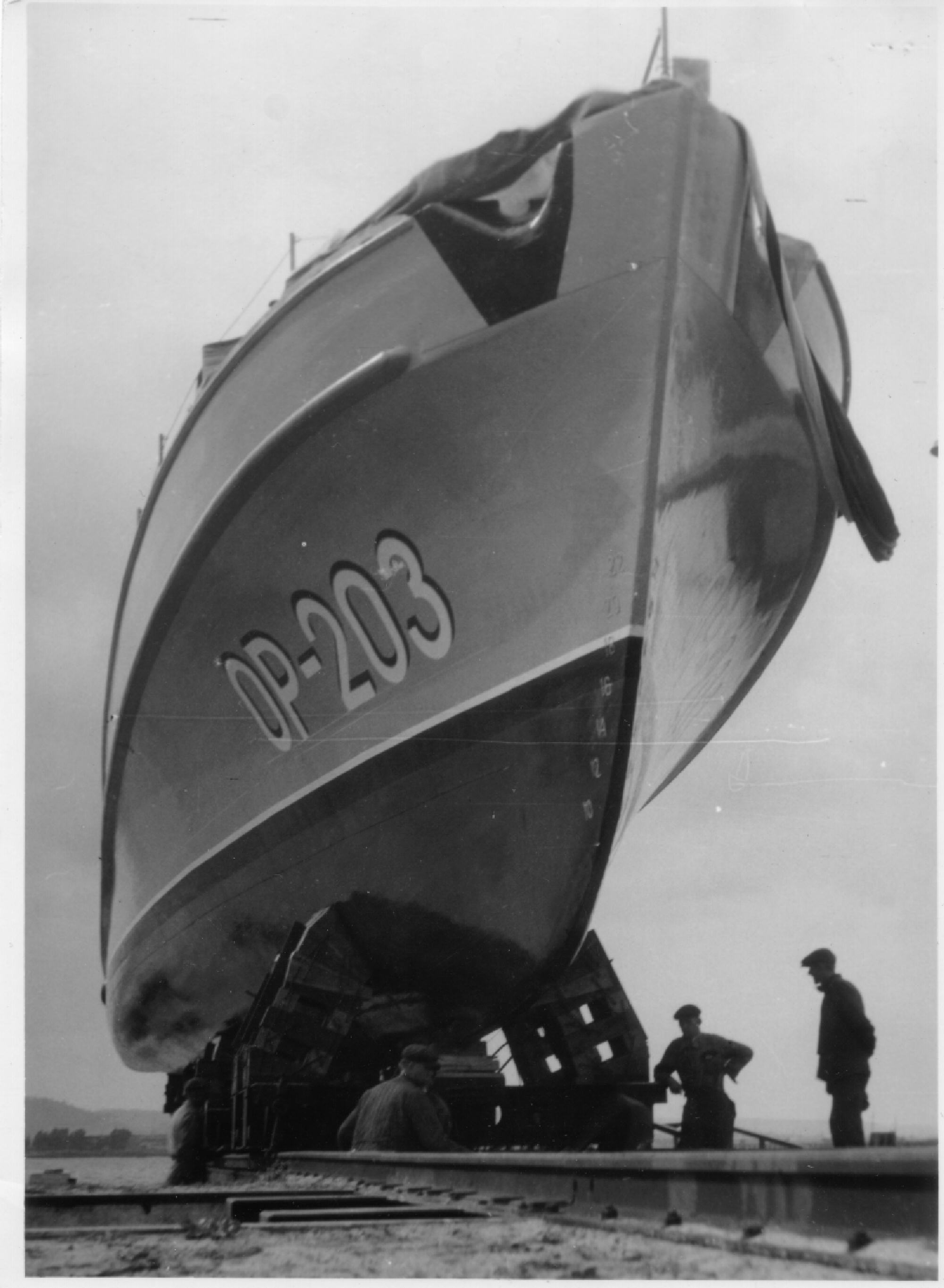 Wodowanie okrętu patrolowego ORP "Gopło" I. Stocznia MW lata 50-te.