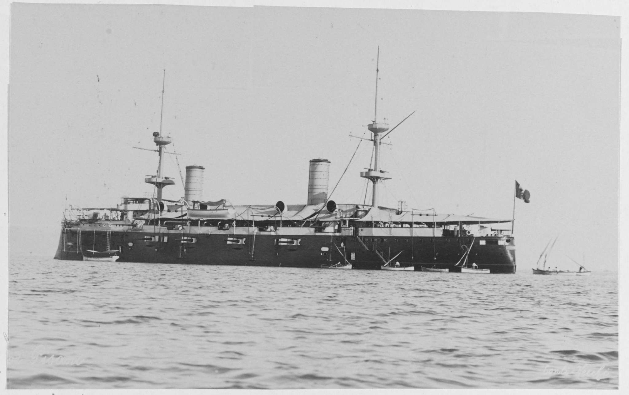 Zamieściłem zdjęcia argentyńskich krążowników pancernych typu Garibaldi, które stanowiły rozwinięcie przedstawionych powyżej jednostek typu Vettor Pisani. więc teraz kolejny okręt z tej "rodziny" - hiszpański Cristobal Colon. Hiszpanie zamierzali początkowo kupić dwa takie okręty (drugi miał się nazywać Pedro de Aragon), ale ostatecznie stanęło na jednym. Wyporność 6840 ton, prędkość 20 węzłów. Uzbrojenie: 2x254/40 BL, 10x152/45 QF, 6x120/40 QF, dwadzieścia małych, 5 wt. Pancerz taki sam jak okrętów argentyńskich. Colon zwodowany został w roku 1896 i wszedł do służby w rok później, ale bez głównego uzbrojenia, które z różnych względów nie zostało dostarczone az do roku 1898. W rezultacie, gdy wybuchła wojna z USA a colon wszedł w skład eskadry Cervery, nie miał głównego uzbrojenia. Wziął jednak udział w działaniach i uczestniczył w bitwie pod Santiago. Udało mu się przerwać blokadę (nie poniósł dużych uszkodzeń), ale uzupełniwszy w Santiago zapasy węgla, wziął na pokład paliwo gorszej jakości i podczas ucieczki jego prędkość w pewnym momencie zaczęła spadać, więc okręt został zatopiony przez własną załogę. Amerykanie próbowali go uratować, ale im się nie udało.