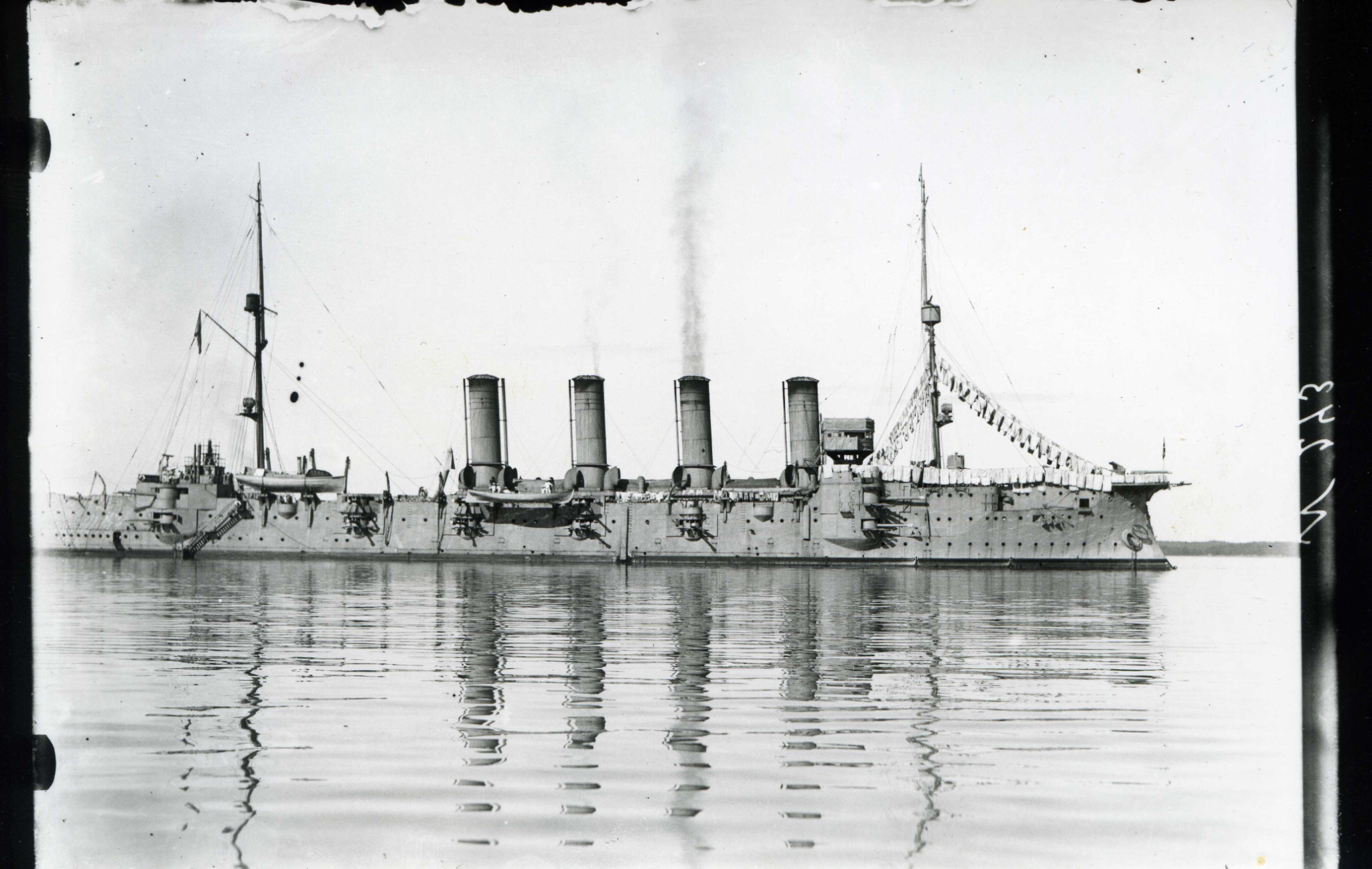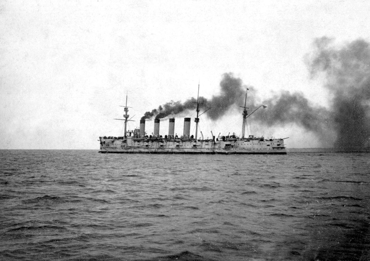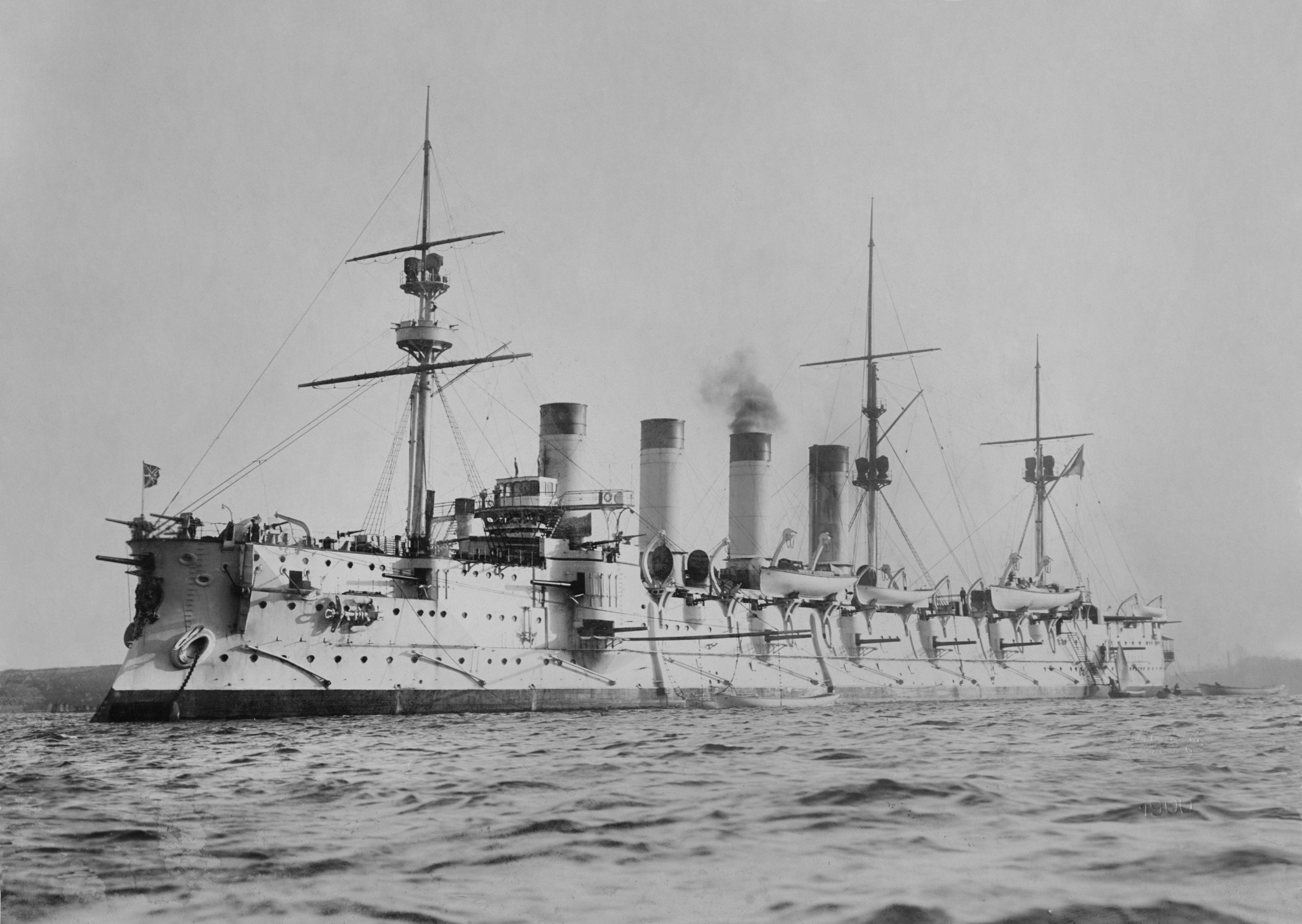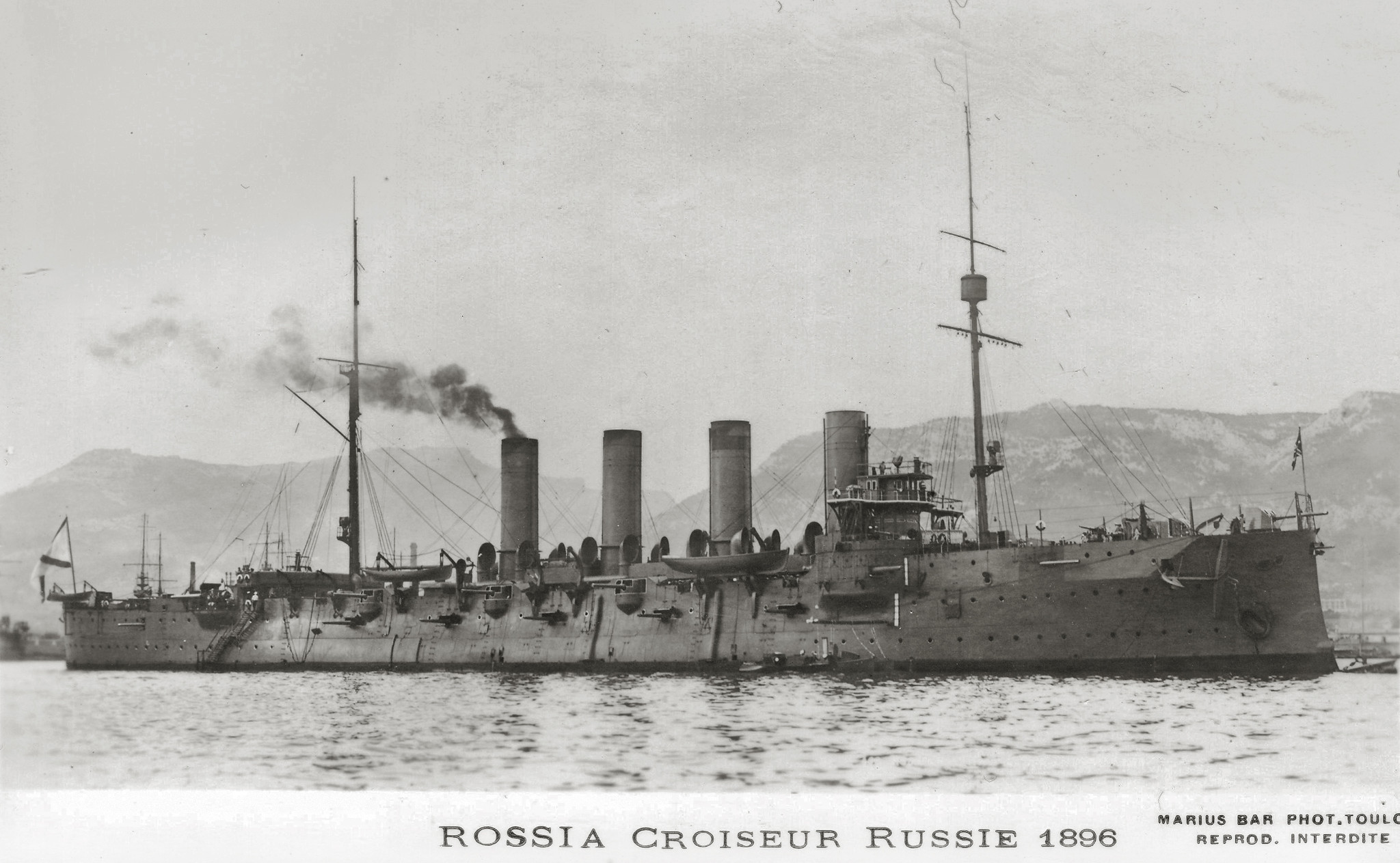 Rosyjski krążownik pancerny Rossija. Stanowił rozwinięcie prezentowanego wcześniej krążownika pancernego Riurik (zatopionego przez Japończyków w bitwie pod Ulsan w sierpniu 1904). Rossija, tak jak Riurik, zbudowany został przede wszystkim jako rajder (na wypadek wojny z Wielką Brytanią). Wodowany w 1896 roku, wszedł do służby rok później. Wyporność 13675 ton, prędkość ok. 20 węzłów. Wymiary: 146,5 x 20,9 x 7,9 m. Uzbrojenie: 4x203/45 QF, 16x152/45 QF, 12x75/50 QF i ponad 20 lekkich oraz 5 wt. Pancerz burtowy stanowił stosunkowo wąski i długi na 120 metrów pas pancerny grubości 203-127 mm. Artyleria w większości znajdowała się na odsłoniętych stanowiskach na pokładzie. Okręt aktywnie uczestniczył w wojnie z Japonią, wraz z całą eskadrą władywostocka odnosząc parę sukcesów w zwalczaniu japońskiej żeglugi. Odniósł dość poważne uszkodzenia w bitwie pod Ulsan. Na przełomie 1904/1905 w zamian za 6x75 zamontowano dodatkowych 6x152/45 QF. Później okręt służył na Bałtyku. W 1909 roku przeszedł dość daleko idąca modernizację (łącznie z wymianą kotłów na nowoczesniejsze - prędkośc zwiększyła się do 20,5 węzła), otrzymał też wówczas możliwość zabierania na pokład ok. 200 min. W 1915 roku został przezbrojony został w 6x203/50 QF, 14x152/45 QF i ponad 20 lekkich. Wycofany ze służby na początku lat 20.