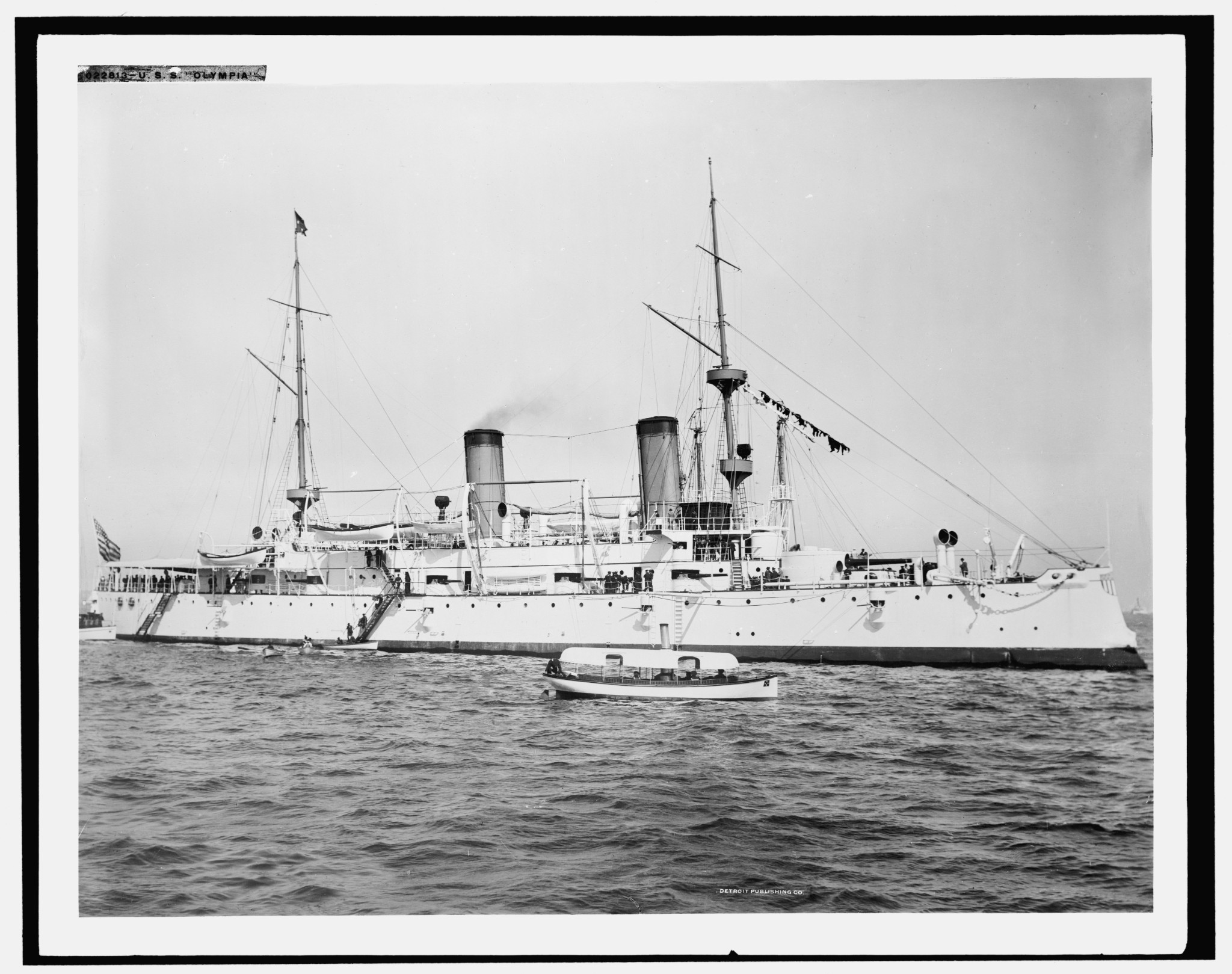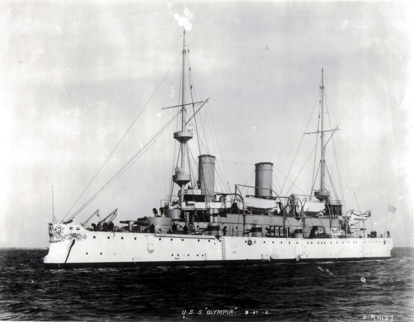 A więc krążownik Olympia, zwodowany w 1892 roku, wszedł do służby w roku 1895. Wyporność 5865 ton, prędkość ponad 21,5 węzła. Uzbrojenie: 4x203/35 BL (w dwóch wieżach - nietypowo jak na krążownik pancernopokładowy), 10x127/40 QF, ponad 20 małych, 6 wt. W momencie wybuchou wojny z Hiszpanią w 1898 roku stacjonował na Dalekim Wschodzie. Wziął udział w bitwie pod Manilą jako flagowy okręt Deweya. Przed I wojną zdjęto z niego wieża z armatami 203mm, natomiast armaty 127 mm wymienione na nowszy model (L/51). Istnieje do dnia dzisiejszego jako okręt-muzeum (a po trochu i okręt-pomnik).