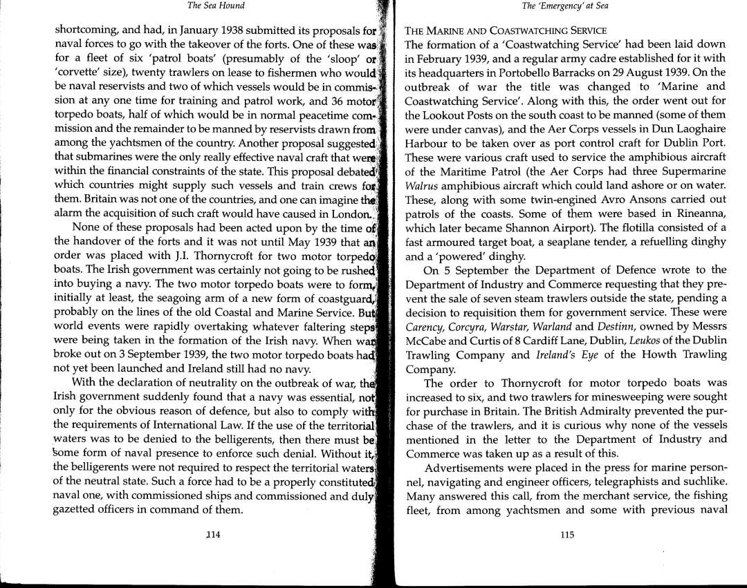Jeszcze jedno uzupełnienie - w ramach pilnowania wybrzeża stworzono The Coastwatching Service. Początkowo tylko od Carnsore Point do County Clare ale w 1940 obejmowało to całość irlandzkiego wybrzeża. Zazwyczaj posterunki obsadzali lokalni mieszkańcy świetnie zaznajomieni z warunkami terenowymi. Posterunki połączone były telefonicznie z lokalnym dowództwem. Posterunki rozmieszczano co 8 do 10 mil ale w taki sposób aby przynajmniej jeden z sąsiednich posterunków był w stanie obserwować posterunek. *