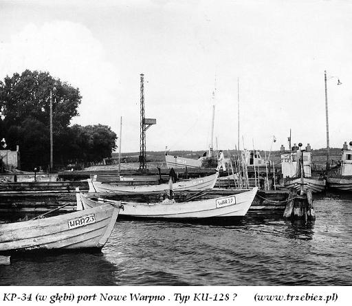Najpierw KP-32 i KP-34 (HUEBNER i RUTKOWSKI?) według Soroki w wersji "usteckiej". Czy tak wyglądały kutry typu "KU-128"? teraz zdjęcie KP-34 w Nowym Warpnie - stoi z tyłu w tle (z http://www.nowewarpno-neuwarp.pl/_ak_nabrzeze_1.html). Wygląda na taki sam typ kutra jak wyżej. I znów Soroka. Tym razem KP-34 jakoby z kutra skonfiskowanego rybakom z RFN. Co to za typ? Skonfiskowany niemiecki czy "K-10"? Patrząc na dolne zdjęcie przyjąłem, że od pokładu do ciemnego pasa iluminatorów sterówki jest jakieś 2 metry (żołnierze ledwie sięgają czapkami i to ci wyżsi). Na górnym zdjęciu odłożyłem sobie odpowiednie kreski pionową i poziomą i wyszło mi, że LOA kutra wynosi jakieś 14-15 metrów. Oczywiście w przybliżeniu, bo nie stał dokładnie burtą do obiektywu lecz trochę skośnie. Może nawet ze 16 m miał?