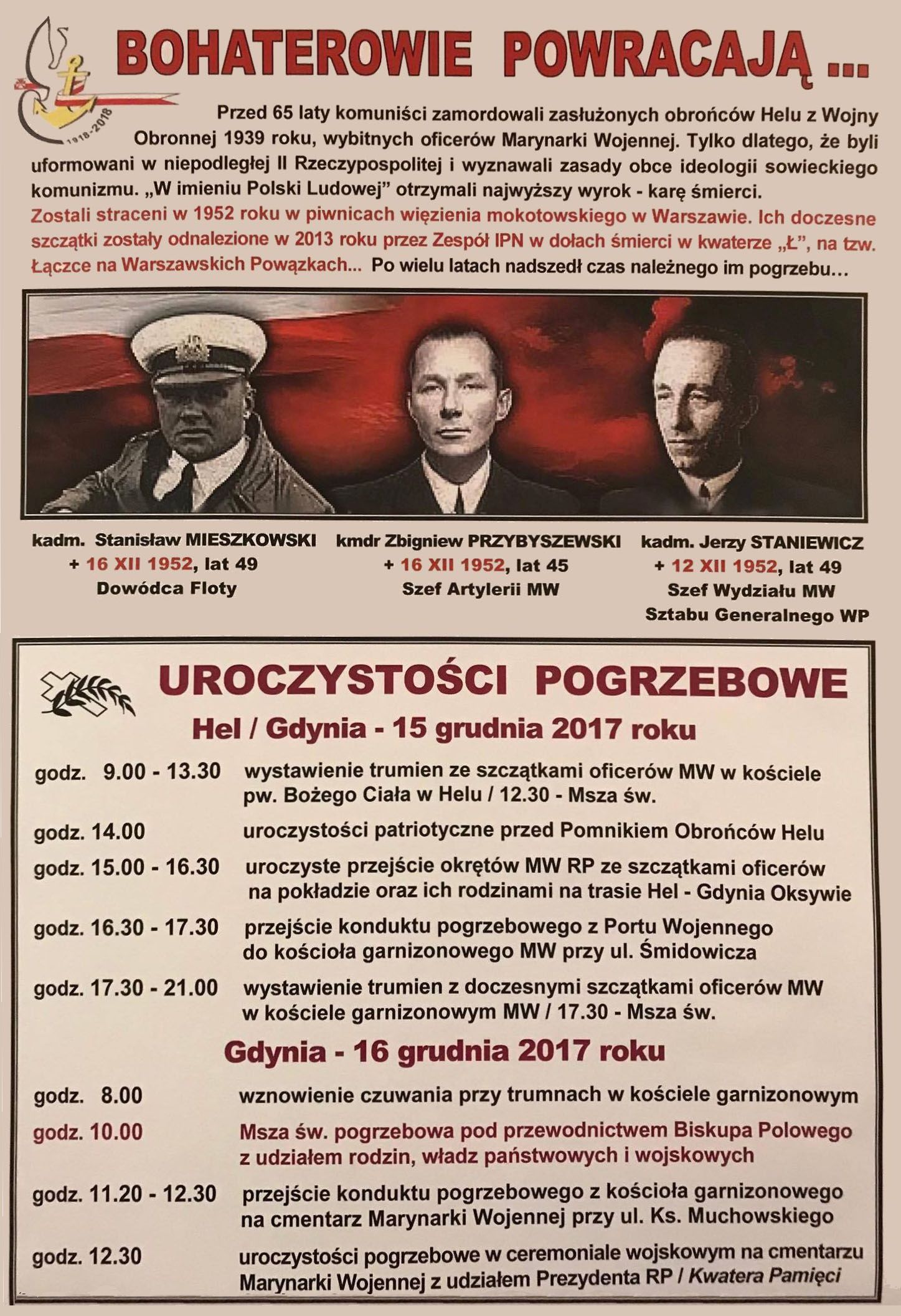 W dniach 15 i 16 grudnia w Helu i w Gdyni odbędą się uroczystości pogrzebowe oficerów MW: kadm. Stanisław Mieszkowski, kadm. Jerzy Staniewicz, kmdr Zbigniew Przybyszewski.