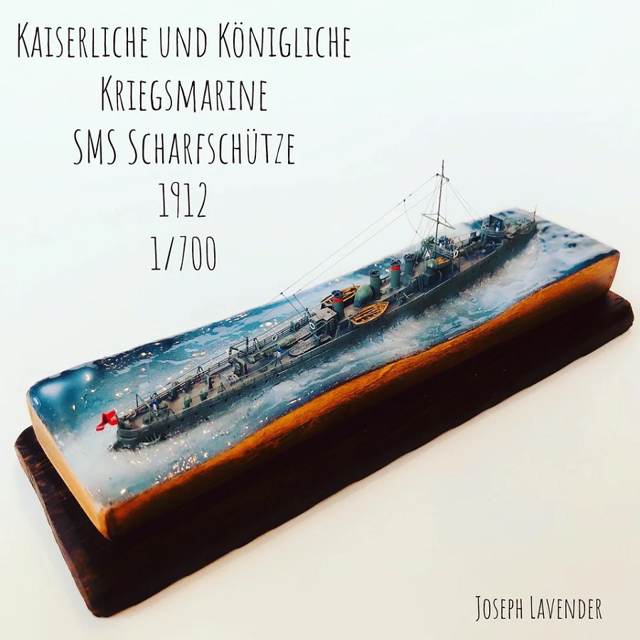 Zaczynam pracę (okazyjnie dla upamiętnienia pierwszego dowódcy PMW Bogumiła Nowotnego) nad dioramą w skali 1/700 obrazującą jego brawurowy atak na Porto Corsini 24 maja 1915 r. Dla nie zaznajomych ze zdarzeniem polecam wspomnienia Nowotnego lub zapytanie wikipedii. CK kontrtorpedowiec SMS "Scharfschütze" miał zadanie wedrzeć się do portu Corsini, narobić bałaganu, zatopić co tylko się da i przeżyć. Ponieważ kontrtorpedowiec miał 68 m długości a 1200 m kanał portowy tylko 40-50 m szerokości, więc aby nie musieć manewrować pod ogniem, Nowotny wpłynął do portu przez kanał rufą, nabałaganił i gdy Włosi oprzytomnieli z zaskoczenia spokojnie nawiał po ogniem na otwarte wody. Moja diorama ma przedstawiać końcową fazę potyczki (okręt pod huraganowym ostrzałem, multum włoskich żołnierzy wybiegających z koszar, ogień CKM-ów i baterii dział polowych, okopy, zasieki, wybuchy, itp.). Ale to teraz mało ważne. Do rzeczy: