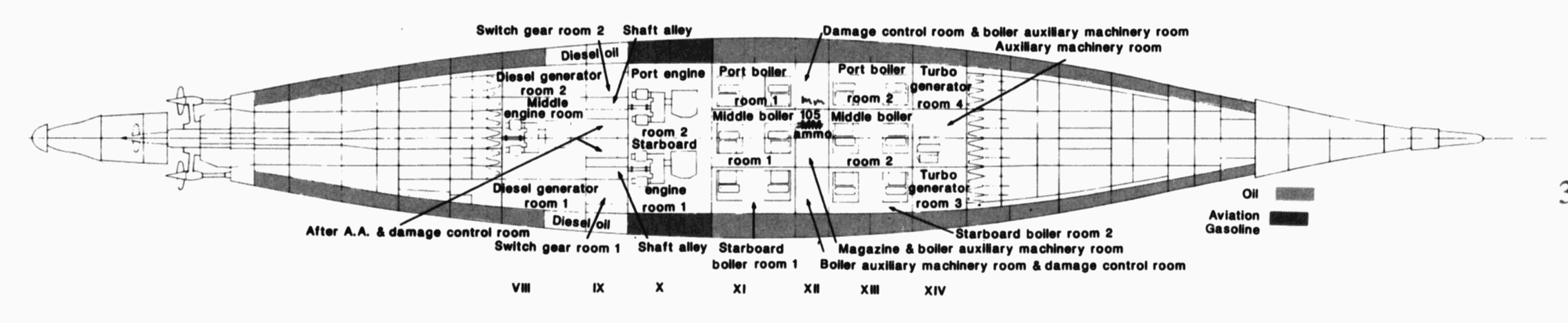 Tylko nie ten schemat wziąłeś (ten chyba obrazuje plan transportu węgla z bunkrów do kotłowni, ale bez opisu nie dam sobie ręki uciąć). Tam są dokładniejsze rysunki Bayerna a podejrzewam że jakimiś schematami z rozrysowanymi kotłami Bismarcka masz. Od razu widać u Niemców odwrót od upakowanych i zwartych pomieszczeń, na rzecz bardziej brytyjskiego stylu. Przyznam że początkowo byłem trochę sceptyczny do tego co widzę, ale mam swego rodzaju potwierdzenie z innego źródła: