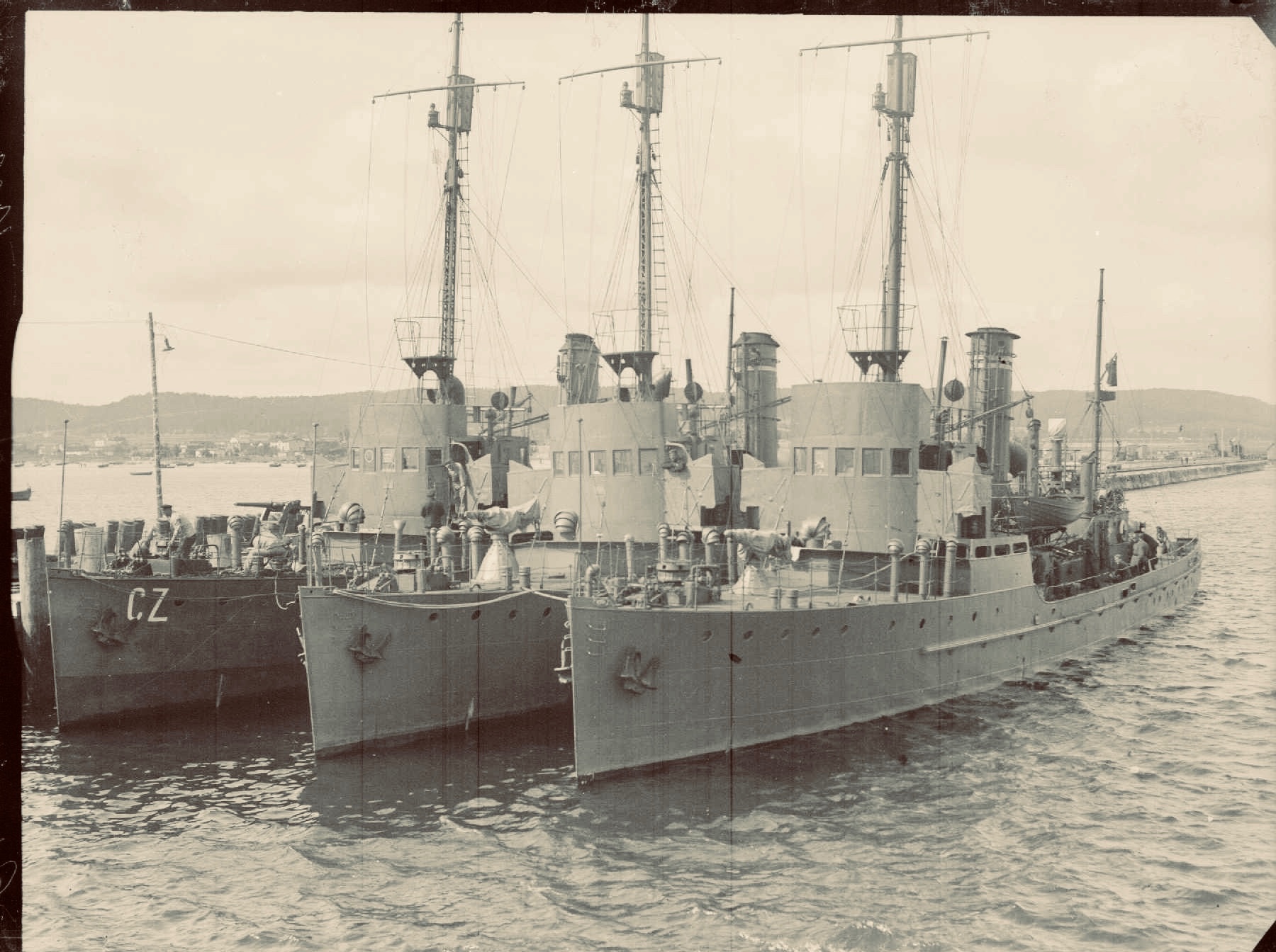 I jeszcze zdjęcie ORP CZAJKA z literami CZ na burcie. Stojące obok: ORP JASKÓŁKA i ORP MEWA nie mają takiego oznaczenia, mają tylko opaski na kominach.